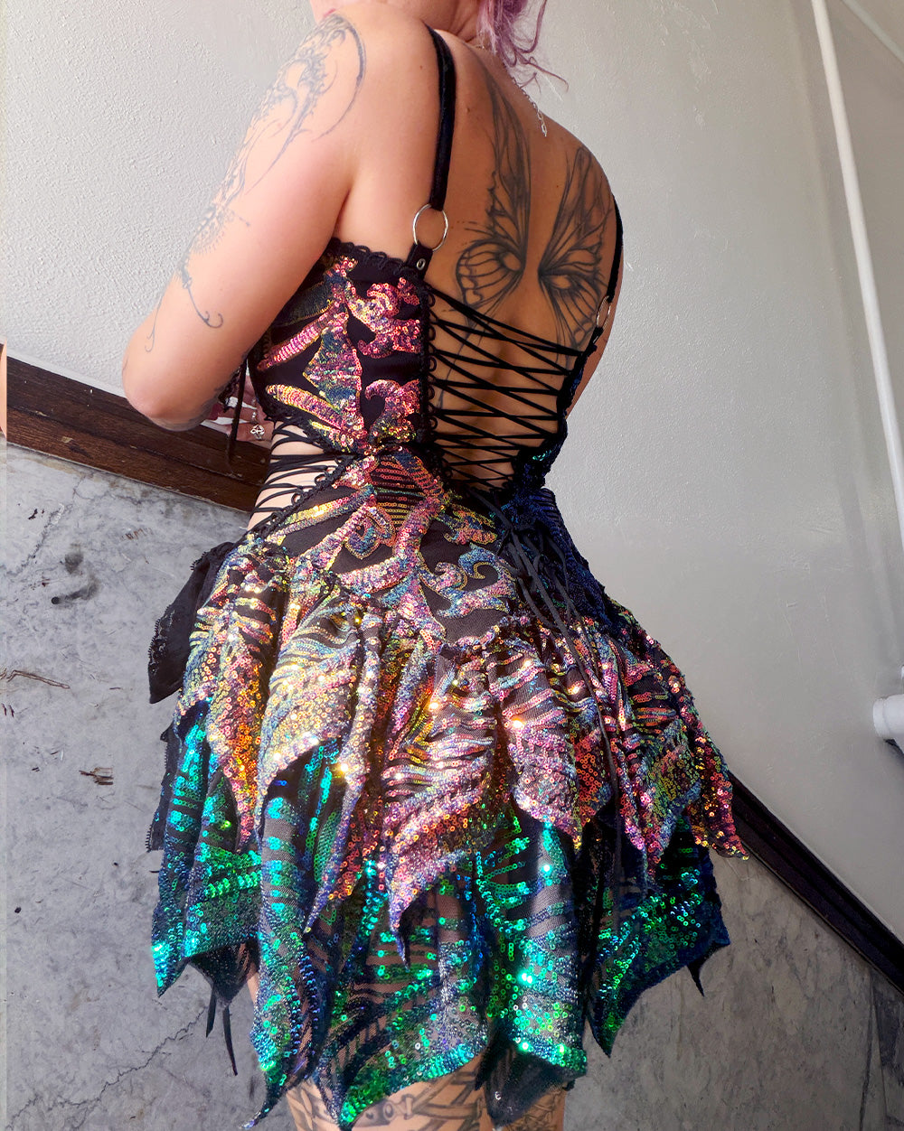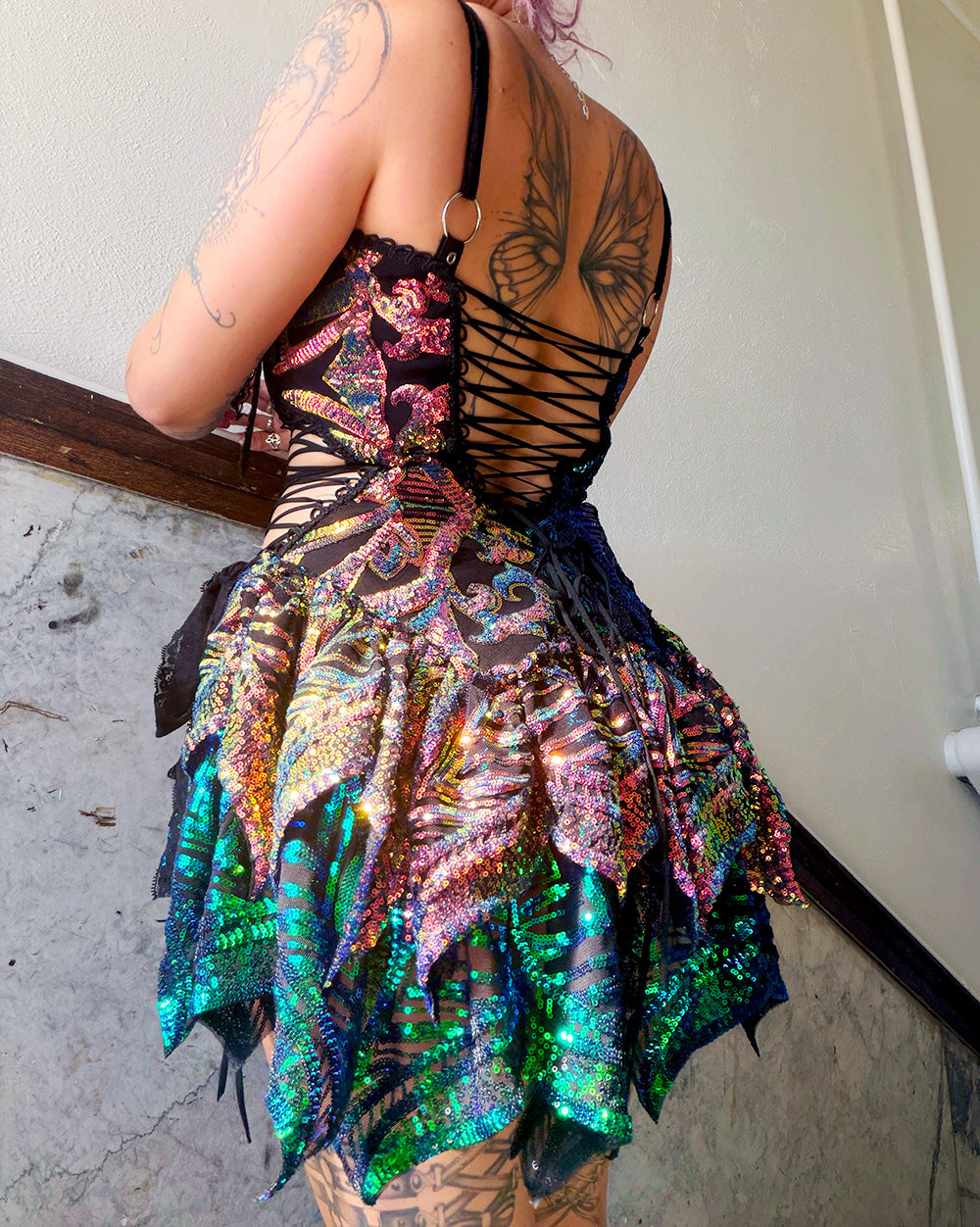 Sequin corset mini dress lined with cotton with mermaid tail ruffles. Lined with black cotton The dress is adjustable with a corset lace up back & lace up on waist with bow closure on the hip.