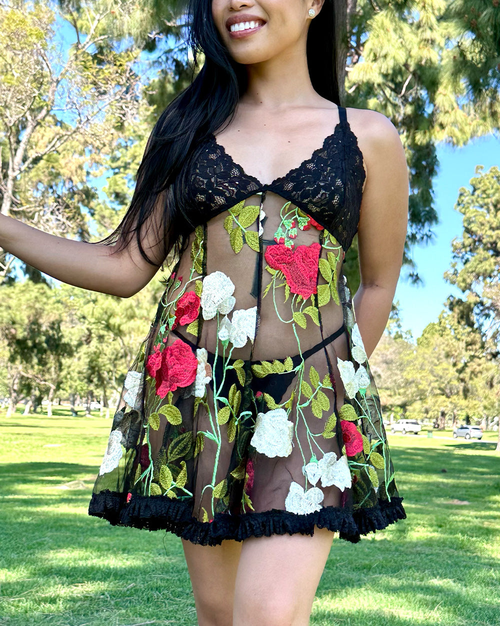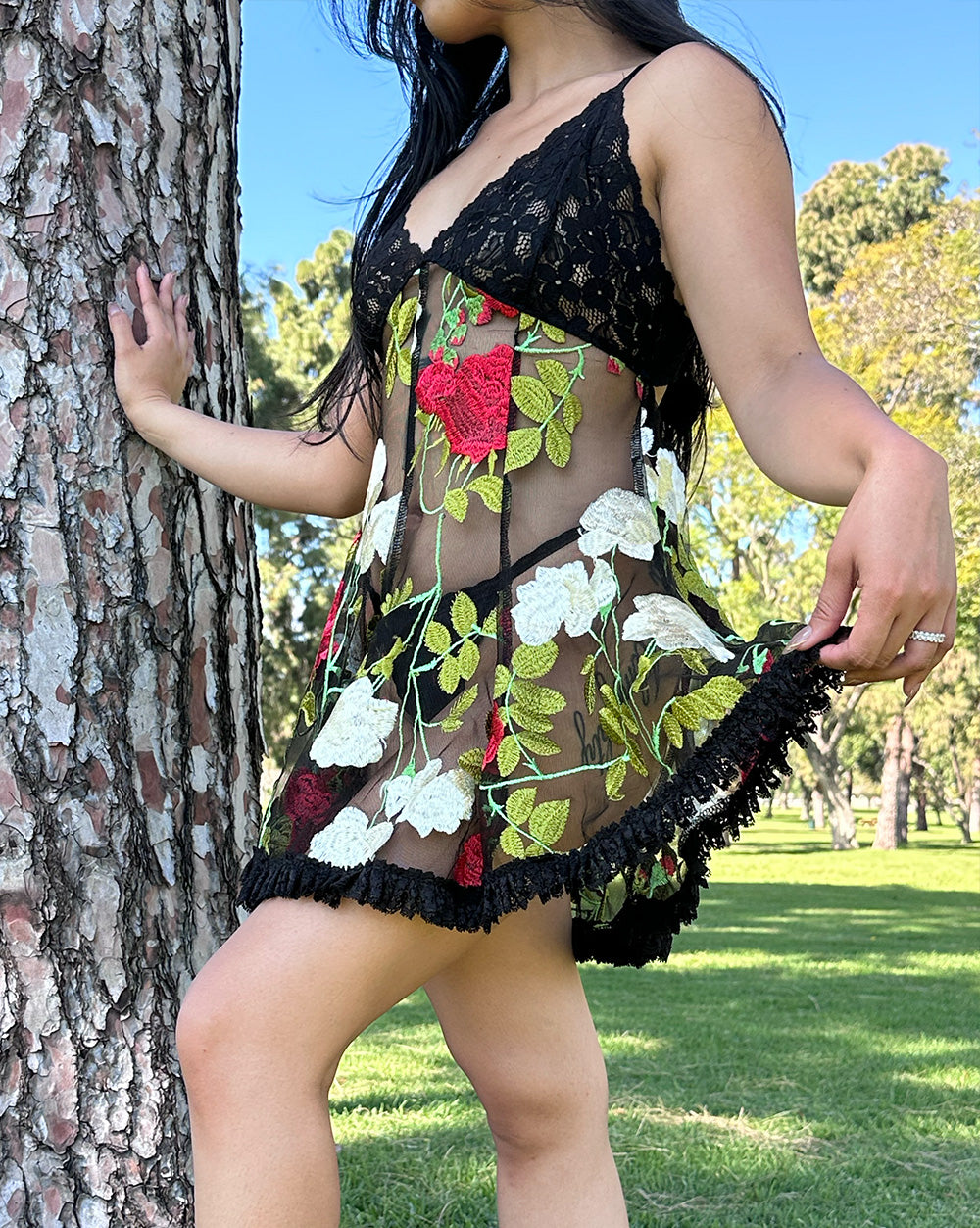 Floral embroidery lace slip dress. Adjustable bra straps and lace closure around back.