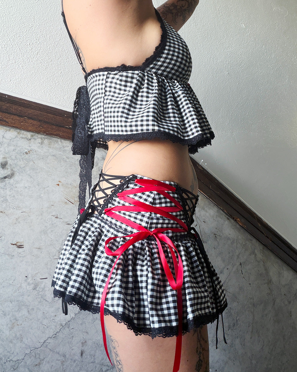 Black checker lace up micro skirt. Comes with matching ruffle top. Adjustable straps & lace up on back. Bloomers have elastic waistband and elastic stretch around thigh.