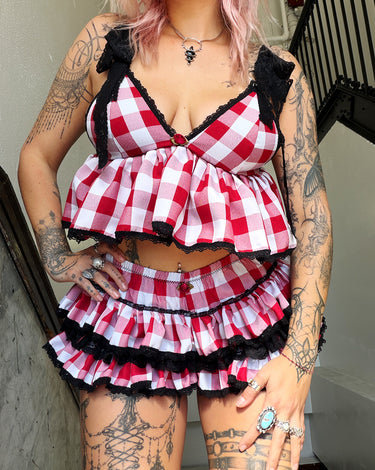 Red checker bloomers set. Comes with matching ruffle top. Adjustable straps & lace up on back. Bloomers have elastic waistband and elastic stretch around thigh.