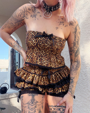 Cheetah bloomers set. Comes with matching stretchy strapless top. Bloomers have elastic waistband and elastic stretch around thigh.