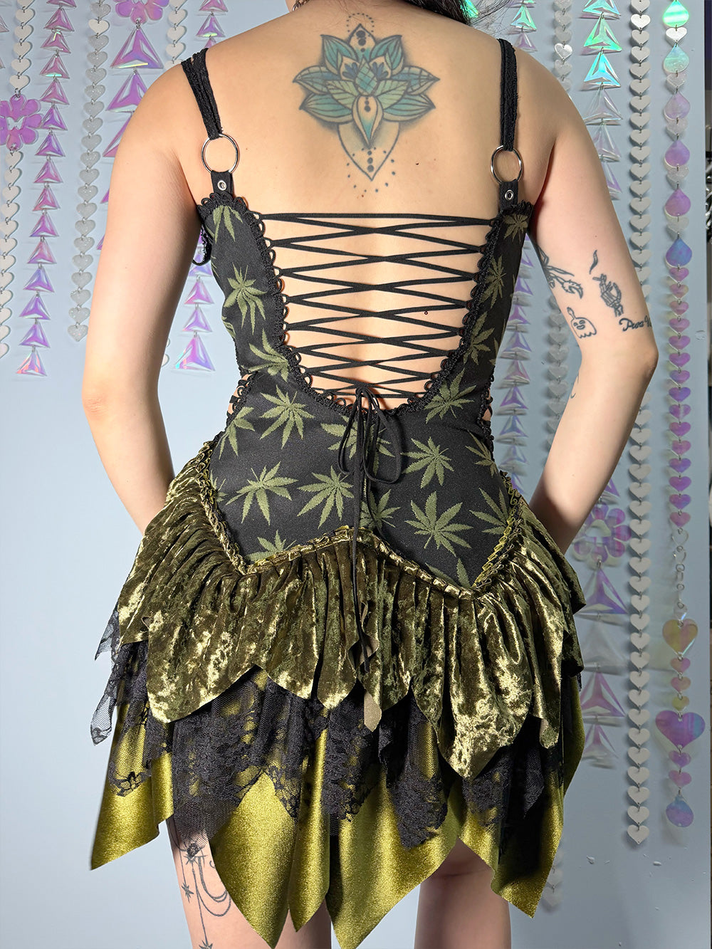 Upholstery corset mini hourglass dress with layers of fairy cut ruffles. Corset is lined with cotton. The dress is adjustable with a corset lace up back & lace up on waist with bow closure on the hip.