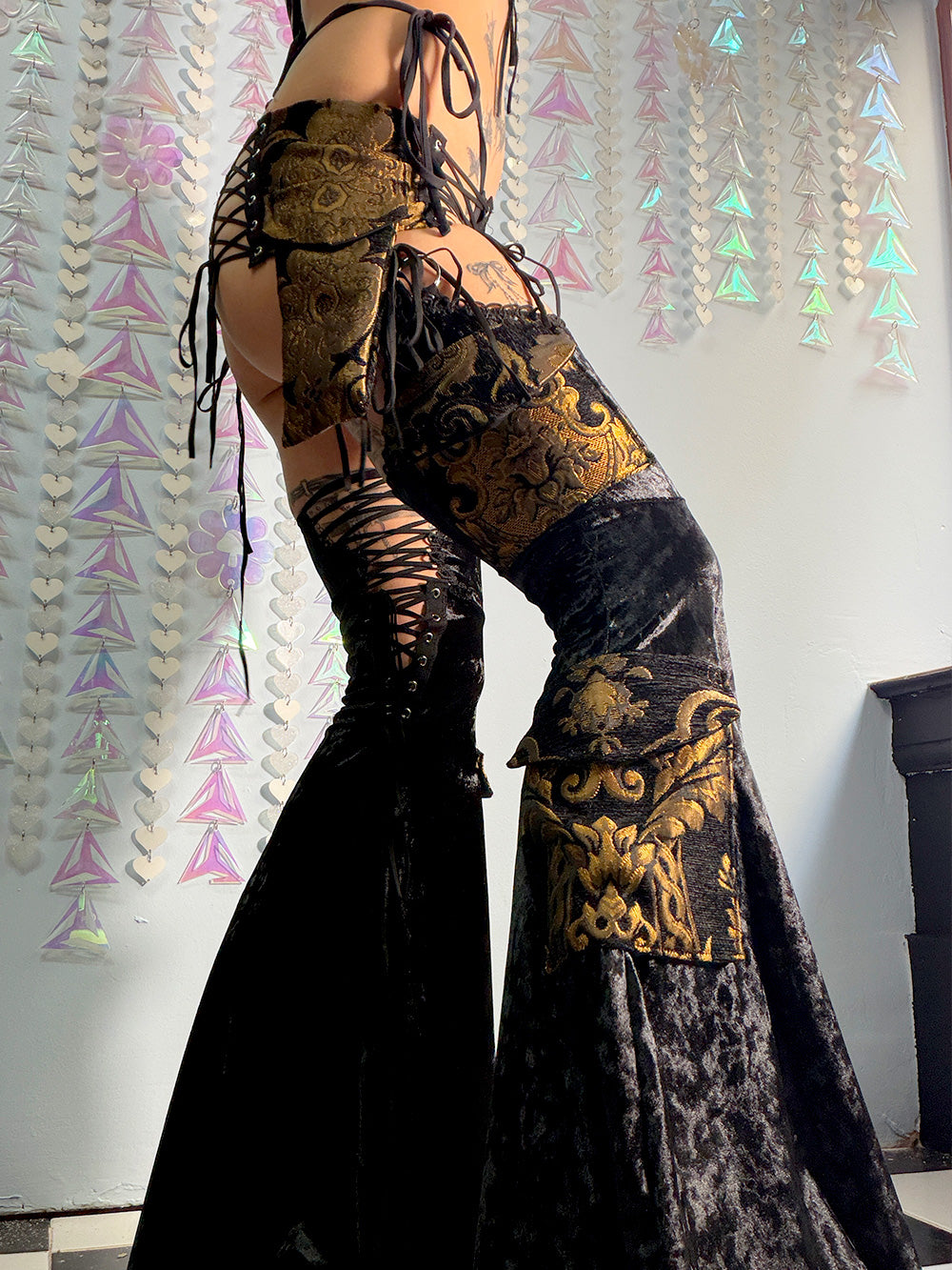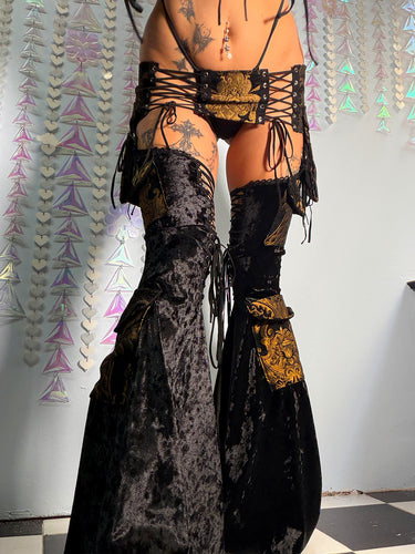 Crushed velvet chaps with upholstery argo pocket. Grommet detailing.